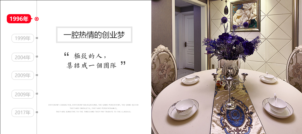 正是這個(gè)想法讓他不惜賣掉房子全身心投入到嘉之信的事業(yè)中,勇敢地去闖、去想、去創(chuàng)新、去做他想做的事情;貧w生活本真將藝術(shù)融進(jìn)生活,安插于一點(diǎn)一線、一物一什之中,與人分享家的溫馨。誠摯的初衷打動(dòng)了很多人,這就是能做21年的魔力所在。從開始的6人核心團(tuán)隊(duì)到目前成熟的企業(yè)運(yùn)作,他摸爬滾打了21年。從初出茅廬到四十不惑依舊堅(jiān)持著。這位就是我們的創(chuàng)始人——?jiǎng)嘞壬?