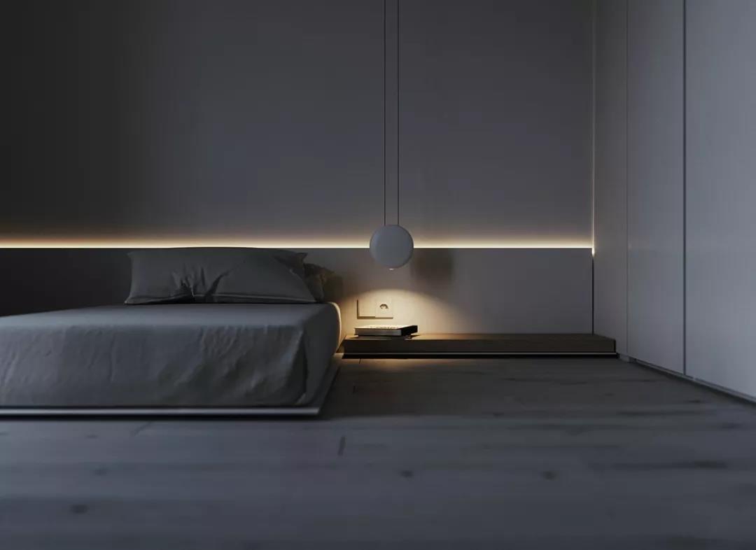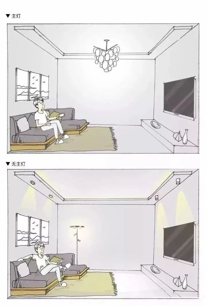 ▲有無主燈的區(qū)別,在臥室里尤為明顯,換句話說,臥室里主燈基本退休了,許多時候設(shè)計(jì)了主燈也只是為了滿足裝飾效果。主燈照明會影響睡眠質(zhì)量,只能關(guān)閉,而一關(guān)全屋黑的狀態(tài)嚴(yán)重影響燈光體驗(yàn),比如妻子休息,丈夫還有看書的需求,那么一盞臺燈或閱讀吊燈就可以解決這個問題。