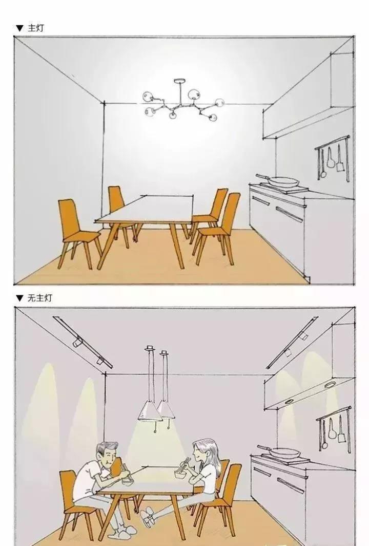 ▲有主燈餐廳幾乎可以做到無死角照明,但無法對局部進(jìn)行強(qiáng)調(diào),無主燈餐廳,每個部位可根據(jù)需要進(jìn)行燈光設(shè)計(jì),實(shí)現(xiàn)多種生活場景融合,餐桌吊燈能突出用餐區(qū),促進(jìn)食欲,櫥柜射燈突出照亮操作區(qū),避免人擋住頂燈照明帶來的死角。