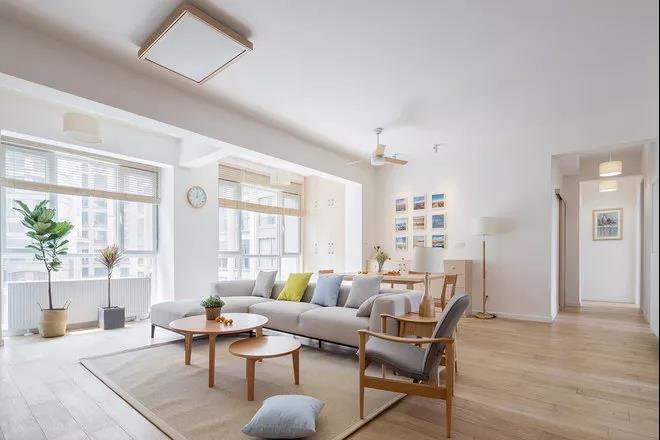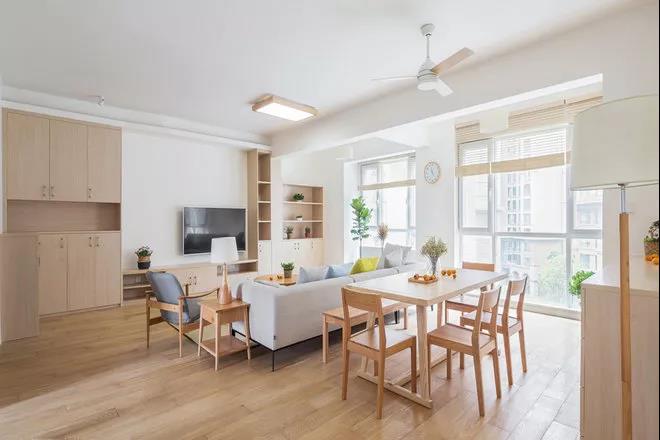 客廳里地板也是原木色的地板,搭配淺色系的布沙發(fā),很有舒適感,顯得很簡單大方。還在地面鋪了原木色系的地毯,地毯上是原木的橢圓茶幾,周圍還有綠植點綴,整個客廳都十分溫馨舒適。