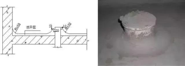 管根、墻角管根及墻角處抹圓弧,半徑10mm。管根與找平層之間應留出20mm寬、10mm深凹槽。