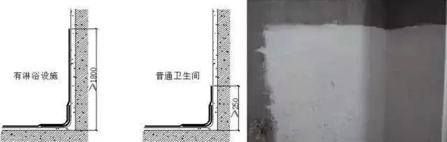 高度地面四周與墻體連接處,防水層應往墻面上返300mm以上,有淋浴設施的廁浴間隔墻面,防水層高度不應小于1.8m。
