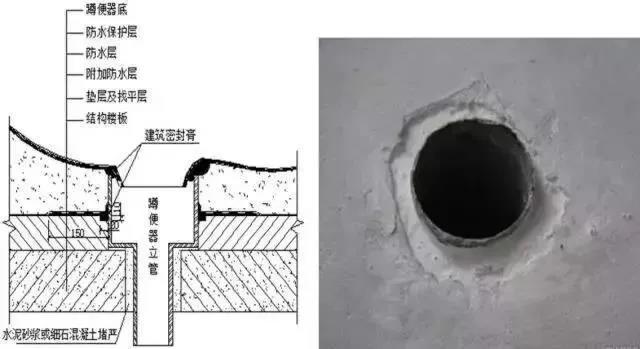 蹲便器管根與混凝土(水泥砂漿)之間應留凹槽,槽深10mm、寬20mm,槽內嵌填密封膏;蹲便器底部與立管相接處應加設密封膏。