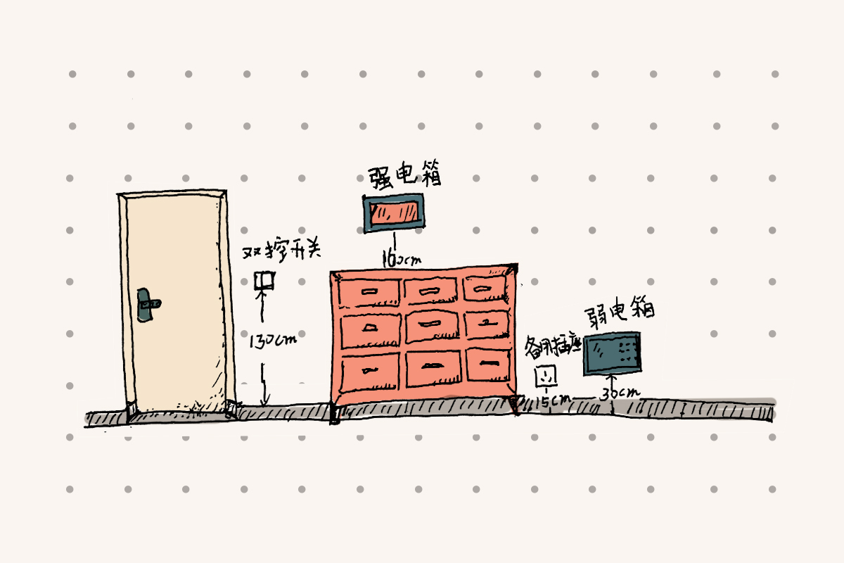 臥室門后面需要安裝臥室照明開關(guān),高度是130cm。