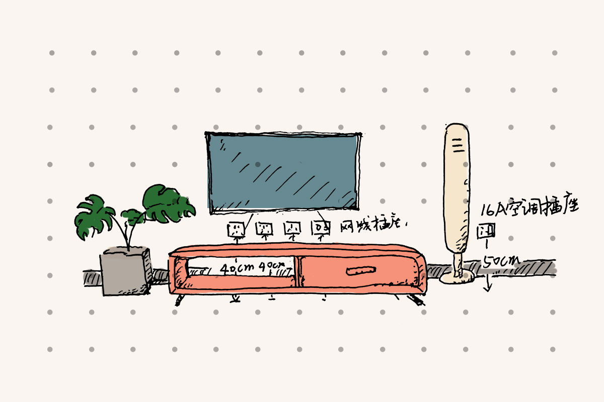 電視柜旁邊如果是空調(diào)的位置,要留一個(gè)16A帶開關(guān)的插座,方便放置立式空調(diào)。