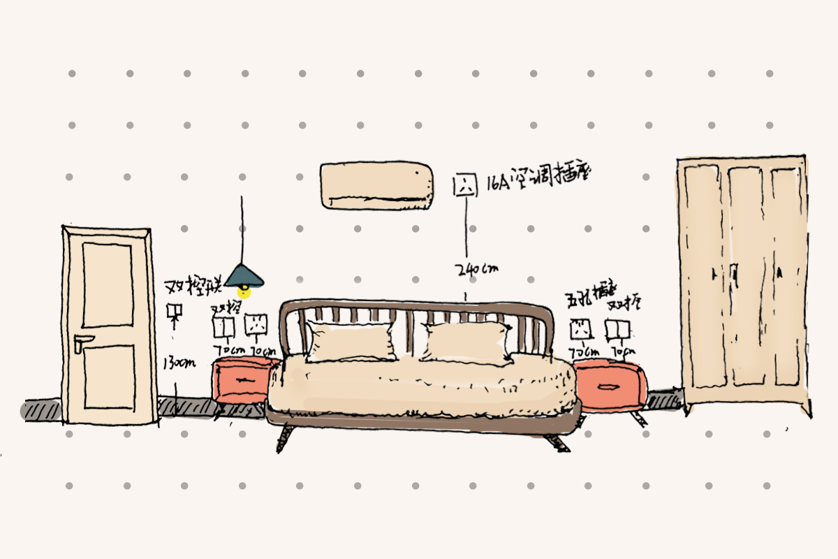 臥室需要留出1個(gè)16A空調(diào)插座,高度在200cm左右。